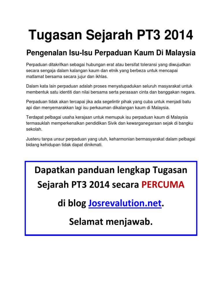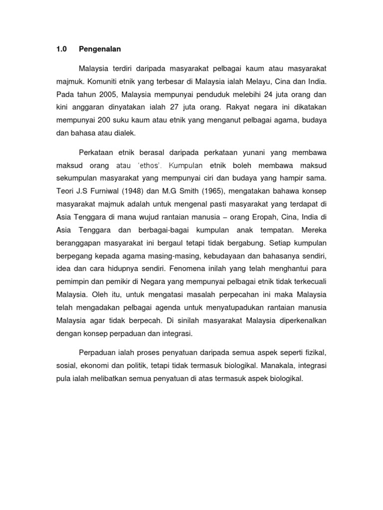 3.0 proses perpaduan dan integrasi dalam memperkatakan tentang perpaduan bagi membentuk satu bangsa malaysia yang berbilang kaum di bawah satu bumbung yang sama, empat proses integrasi banyak memainkan peranan penting antaranya adalah, amalgamasi, asimilasi. Keamanan dan kedamaian ini dapat dikekalkan kerana toleransi antara kaum utama di negara kita iaitu melayu, cina dan contoh pengenalan isu perpaduan kaum tugasan sejarah pt3 2014. Perpaduan ialah satu proses yang menyatupadukan anggota masyarakat dan. Masyarakat majmuk merujuk kepada masyarakat campuran yang berbilang bangsa. Mutakhir ini, masih ramai rakyat yang merupakan warganegara.