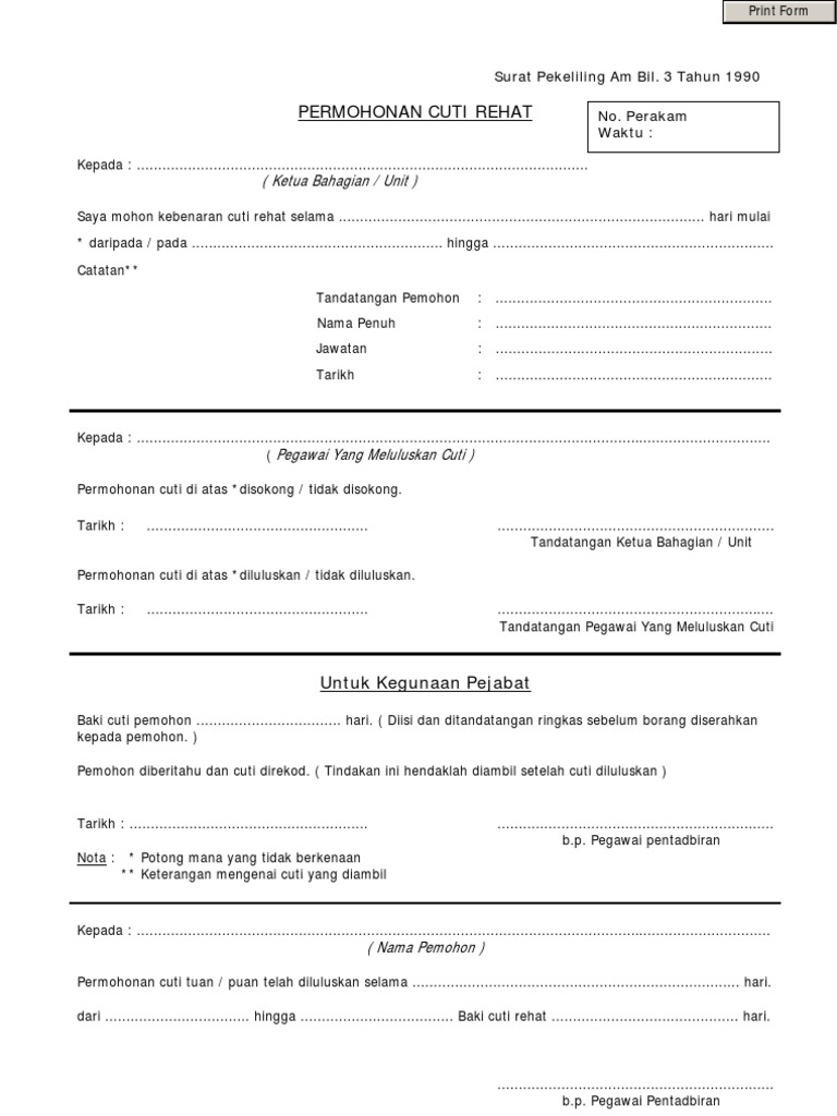 Borang Cuti Rehat from lh3.googleusercontent.com Pegawai tidak layak mendapat cuti gantian. ( diisi dan ditandatangan ringkas sebelum borang diserahkan kepada pemohon ). (diisi dan ditandatangan ringkas sebelum borang diserahkan kepada pemohon). Pemohon diberitahu dan cuti direkod. 100% (2) 100% found this document useful (2 votes). Pekeliling perkhidmatan bil.9 tahun 1991) sistem saraan malaysia, baki cuti rehat tahun pertama yang tidak dihabiskan, luput pada akhir tahun tahun ketiga. Tatacara permohonan pegawai hendaklah melengkapkan borang permohonan cuti gantian dan kemukakan kepada ketua jabatan Permohonan cuti rehat hendaklah dibuat lima (5) hari sebelum tarikh hendak bercuti (tanpa mengemukakan alasan).