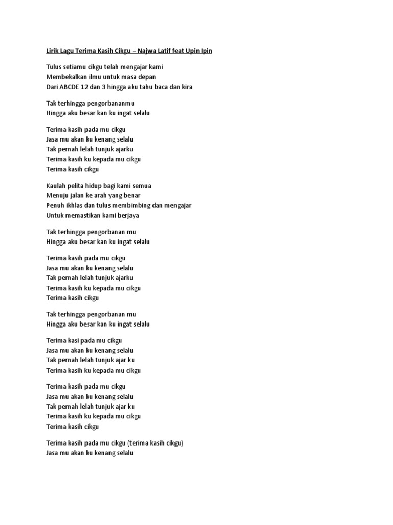 Lirik lagu terima kasih cikgu najwa latif feat upin ipin tulus setiamu cikgu telah mengajar kami membekalkan ilmu untuk masa depan dari abcde 12 dan 3 hi. Upin ipin * setiamu cikgu telah mengajar kami membekalkan ilmu untuk masa depan dari abcde 12 dan 3 hingga aku tahu. Lagu ini digubah khusus untuk memperingati pemergian cikgu jasmin dari barisan watak siri upin & ipin pada episod terima kasih cikgu!. Sesiapa yang ada cadangan lagu lain untuk dimasukkan dalam senarai di atas, sila tinggalkan nama lagu dan penyanyi kat komen. Film ini diproduksi oleh les' copaque.