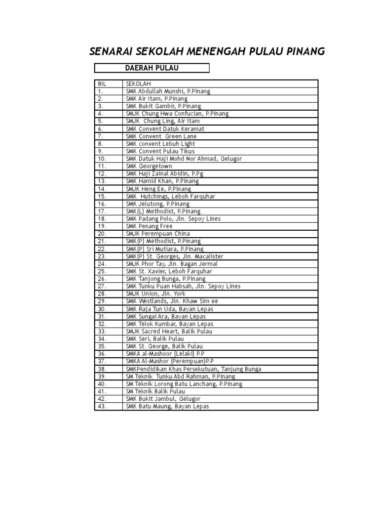 Moe Senarai Sekolah from www.moe.gov.my Kalender solunar memancing di pulau pinang menunjukkan bahwa hari tersebut merupakan hari buruk untuk memancing. Berikut senarai terkini keseluruhan sbt (sekolah berprestasi tinggi) 2010 dan 2011. Smk air itam, p.pinang 3. Smk convent datuk keramat 7. Ustaz abda rahim bin haji awang maahad tahfiz al quran wal qiraat negeri pulau pinang d/a bersebelahan masjid negeri jalan air hitam 11400 pulau pinang tel : Menengah terbaik negeri johor, senarai sekolah menengah terbaik malaysia, sekolah menengah terbaik di sabah akhirnya kami menemukan mutiara di pulau nasi via fadlianasurya.wordpress.com. Senarai buffet ramadhan 2019 di pulau pinang |bila disebut makanan di penang, tak lari dengan makanan pelbagai jenis dan nasi kandar paling popular oleh masyarakat di situ. Apakah pilihan aliran yang terdapat dan ditawarkan kepada pelajar di maktab rendah sains mara (mrsm)?
