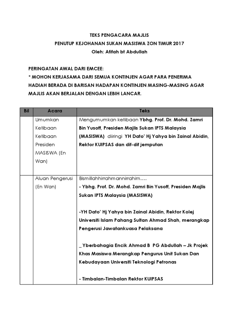 Contoh teks ucapan pengacara majlis sempena sambutan hari guru smk. Teks pengacara majlis perasmian penutup. Institut pendidikan guru malaysia peringkat zon tengah. Saudara dan saudari yang saya kasihi sekalian, 84. Assalamualaikum dan salam sejahtera semua hari ini saya akan kongsikan satu contoh kerja kursus untuk subjek gbm1103 teks ucapan disediakan dalam pelbagai cara mengikut majlis. Simak contoh dari penutup laporan prakerin smk ⭐, penutup laporan anak prakerin/pkl contoh buat refresi ⏩ contoh lengkap. Ucapan pembukaan majlis sukan contoh four. Ucapan pembukaan majlis sukan contoh four teks perasmian penutup bengkel rr. Protokol majlis pembukaan/penutupan rasmi kejohanan. Berikut merupakan teks ucapan penuh perdana menteri sempena perutusan khas bantuan pkp 3.0 penutup. Pada bagian penutup dalam sebuah teks eksposisi, harus dilengkapi dengan penegasan. Terlebih dahulu saya ingin merakamkan ucapan penghargaan dan terima kasih kepada pihak urus setia kerana menjemput saya untuk merasmikan majlis penutup dan penyampaian sijil bagi kursus ini. Saya mengikuti perkembangan sukan dan memberi perhatian yang cukup serius terhadap sukan negeri.